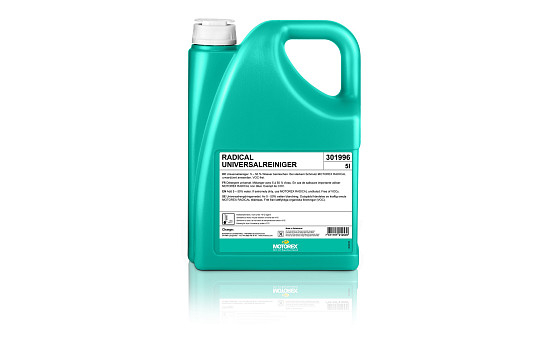 MOTOREX RADICAL je univerzální čistič obsahující neiontové a kationtové aktivní čisticí látky. Díky jejich speciální kombinaci má vynikající odmašťovací schopnosti. Nezpůsobuje problémy při použití s čističkami odpadních vod. Neobsahuje rozpouštědla. Nepěnivý. Snadno odděluje olejové/vodní emulze.